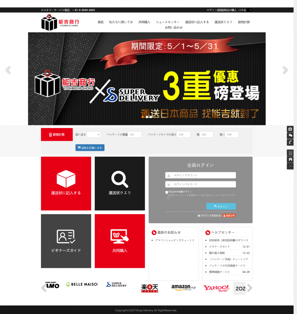 日本能吉商行-Ninja Delivery委托我们为其开发网站及国际快递物流管理系统,能吉商行公司是专业从事日本到台湾、香港东南亚等地国际快递业务的公司。系统采用中文简体、中文繁体、日语、英语多语言版本,方便各个不同国家和地区的客户使用。并且系统对接了日本和台湾的在线支付接口,方便接收不同的货币。